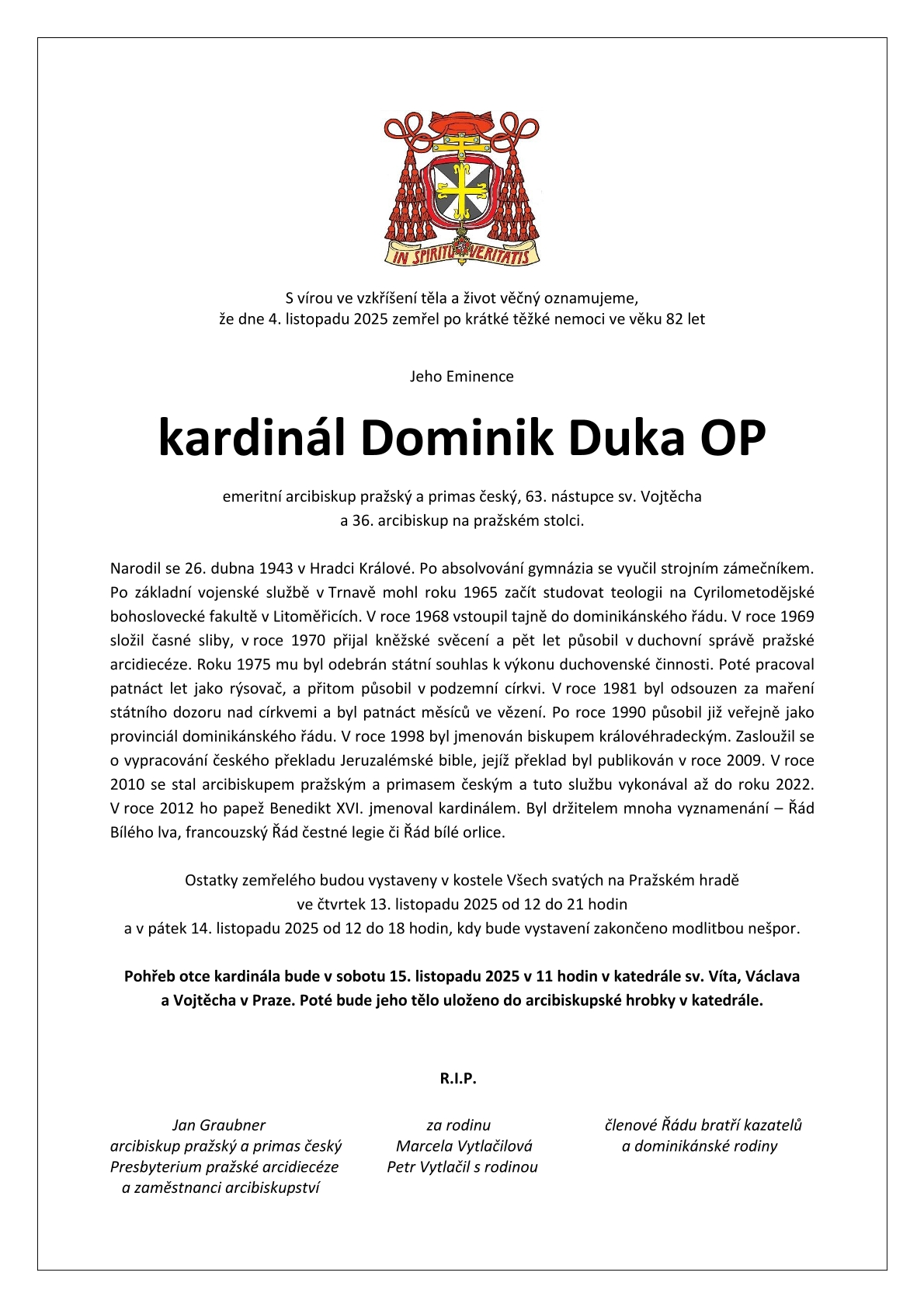 V úterý 4. listopadu Pán života a smrti k sobě povolal pana kardinála Dominika Duku, emeritního pražského arcibiskupa. Papež Lev zaslal kondolenční telegram, ve kterém mimo jiné píše: Vzdáváme díky Bohu za jeho intenzivní pastorační dílo a s obdivem vzpomínáme na jeho odvahu v období pronásledování, kdy navzdory nesvobodě zachoval věrnost Kristu a církvi. S otcovským srdcem vedl Boží lid, podporoval smíření, náboženskou svobodu a dialog mezi vírou a společností.